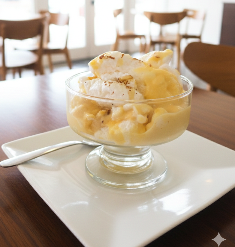 Suave crema de vainilla con un toque de almendras crocantes, creando un contraste perfecto entre textura y sabor.