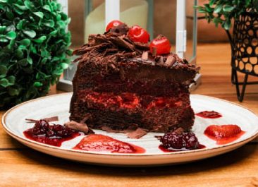 Clásico bizcochuelo de chocolate, generosamente relleno de frutos rojos y humedecido con un toque de brandy para realzar su sabor